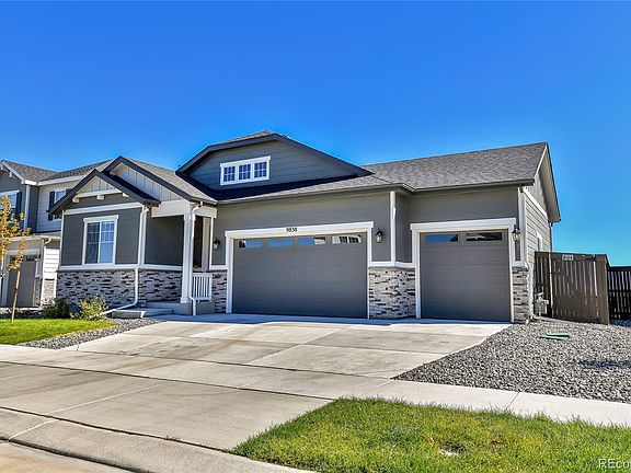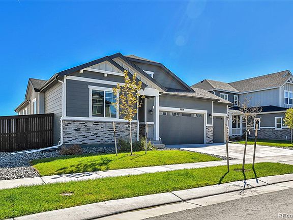 Welcome to this stunning 5-bedroom, 3-bathroom ranch-style home built in 2022, offering modern design and an abundance of natural light. The open, light and bright floor plan features a spacious living room with a beautiful gas fireplace, and a dining room perfect for entertaining. The kitchen boasts stainless steel appliances, a pantry, and ample storage. The main level includes the primary suite with a luxurious en-suite bathroom and a huge walk-in closet, along with two additional bedrooms that share a bathroom. Main floor laundry adds convenience to your daily chores. Downstairs, you’ll find a massive family room with endless space for activities, two additional bedrooms, a bathroom, and a large storage area. The fully fenced backyard includes luscious new sod and a large covered patio. The 3-car garage provides plenty of room for vehicles, toys, and gear. Located in a growing neighborhood with a great park, this home offers easy access to Highway E470 and is a short drive to DIA, making commuting a breeze. This home has it all—don’t miss your chance to make it yours!