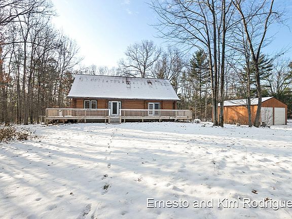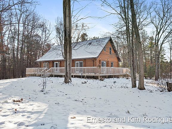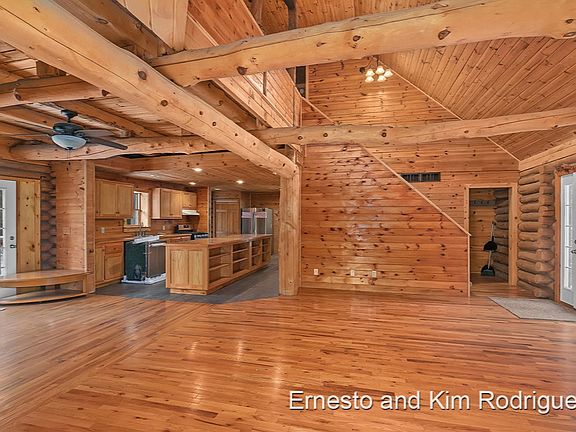 Calling all nature lovers! This stunning log cabin has over 3400 square feet of living space and also sits on over 19 acres of beautiful land. Enjoy the serene view of the outdoors from the wood deck that wraps around the entire house. With 2 huge pole barns measuring 32'x48' and 30'x40' AND a 34'x16' shed, you'll have plenty of storage for all your outdoor toys! This home boasts a spacious kitchen with new appliances, a large island and a walk in pantry. The dining room, living room, master bedroom and full bathroom complete the main floor. Upstairs you will find 2 bedrooms, another full bathroom and a sitting area. In the basement there is a family room, rec room, bedroom, full bathroom and additional storage. Come see this gem today! Buyer to verify all information.