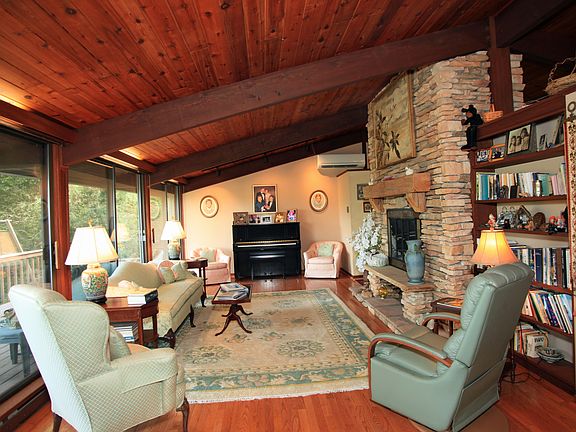 Located in the peaceful and serene community of Holly Berry Estates, on 2.68 acres, this meticulously maintained home offers the privacy you're looking for in the mountains, without the isolation, as it is closely located to Cashiers village. Pulling up to the home, there is ample paved room for parking, along with a two car garage. This home has rustic mountain charm with truly great views of five nearby mountains! Once inside, you experience a warm cabin feel though it is open and bright. The living room features a floor to ceiling stacked stone fireplace, mahogany bookshelves, oak flooring, and cedar ceilings creating a warm ambiance. Posts with beams and a huge wall of windows lend natural sunlight to the open space. There is a nice flow from the country kitchen to the dining room and on into the living room. Off from the living room are a delightful screened porch on one side and an open, uncovered deck with gas jet for grilling. Also on main floor are two bedrooms, two full baths, and an office or artist studio. Every, yes, every window in this home has large views of greenery. There are two additional bedrooms and new full bath on lower level. The larger bedroom has a fireplace and sitting area with access to a large patio. Holly Berry has two private lakes for fishing, canoeing, and community picnic gatherings, in view of awesome Whiteside Mountain.