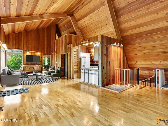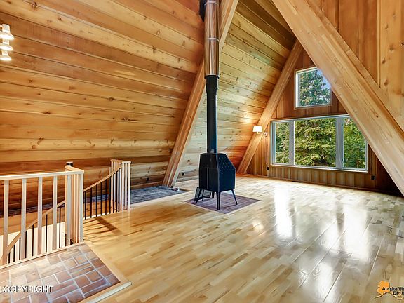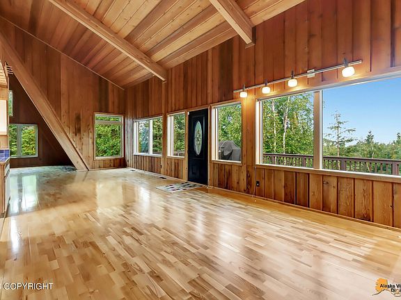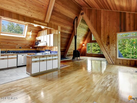 Alaskan chalet home tucked away on a private 2.7 acres of land! Lots of trees, mountain views from the many decks. Classic A-Frame style home with vaulted ceilings, wood floors & huge windows!Upstairs hosts the kitchen, spacious living room & primary BR suite. Lovely private yard with gardens & greenhouse. Detached garage has workshop area. This would be a great place to call HOME!