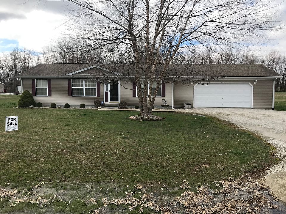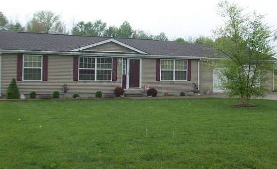Nice 3 bdrm, 2 bath manufactured home. Living rm w/laminate flooring. Kitchen w/dining area, island w/breakfast bar, range, refrig., and DW. Master bath w/garden tub and separate shower. Nicely landscaped. 10x12 shed. Covered back porch. 28x28 attached 2 car garage w/concrete floor and electric. Sitting on 2 acres with an above ground pool with deck.