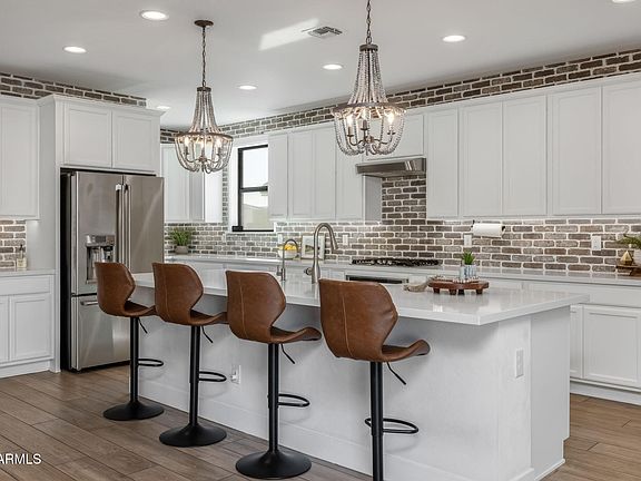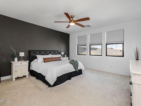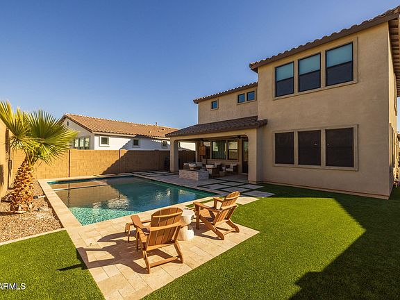 Stunning curb appeal and low-maintenance landscaping welcome you to this exceptional home in the highly desirable Eastmark community. The gourmet kitchen boasts a farmhouse sink, quartz countertops, white cabinets, a brick backsplash, a walk-in pantry, and reverse osmosis, all overlooking a bright and inviting main living space. Downstairs, you'll find a dedicated office and a bedroom with an ensuite bathroom for added convenience. Upstairs features a spacious loft, two additional bedrooms, a laundry room, and the luxurious primary suite. The primary suite is filled with natural light and offers dual sinks with ample cabinet space, artistic tile flooring, a large walk-in shower with a rainfall showerhead, and a massive walk-in closet. Step outside into your private backyard retreat, where every detail has been thoughtfully designed for relaxation and entertainment. The saltwater pool features a Baja step perfect for lounging, a rejuvenating spa, and is heated. Travertine tile surrounds the pool, creating a luxurious and low-maintenance space, while the artificial turf adds greenery without the hassle. Additional highlights include epoxy flooring in the 3-car tandem garage and striking black-framed windows. Living in Eastmark offers a resort-style lifestyle with access to luxurious pools, splash pads, parks, Steadfast Farm, and "The Mark," a state-of-the-art clubhouse hosting year-round events and activities. This exceptional home is ready for you to make it your own!