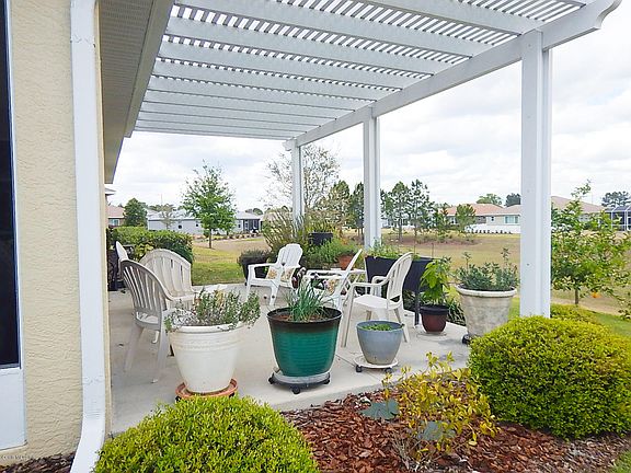Wonderful Berkshire model home located in Windsor West. This lovely home has 2 bedrooms, 2 baths. a flex room, and a 2.5 garage. There is wood laminate and tile flooring throughout the home and the kitchen features pretty maple cabinets and a beautiful backsplash. The laundry room is large with plenty of storage. Spacious master bedroom with huge closet and master bath with double vanity, The home has a whole house filtration system. Step out to your very own Pergola and enjoy the Florida sunshine! Located in Ocala's premier, gated, 55+ community, loaded with amenities, including golf cart access to two shopping centers.
