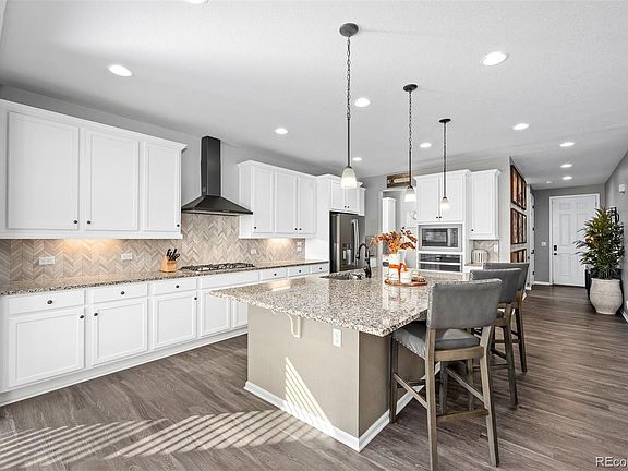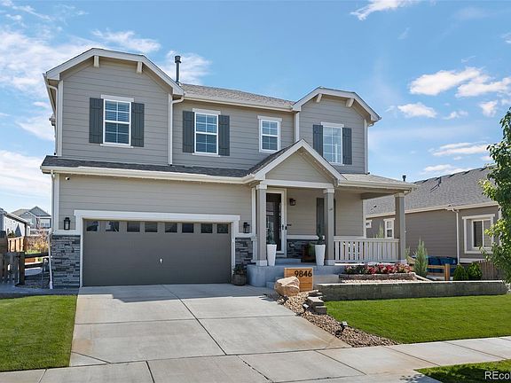 Welcome to your dream home! This incredible residence boasts one of the largest floorplans in the neighborhood, perfect for creating memories. As you step inside, you'll be greeted by a spacious family room featuring a cozy fireplace, ideal for family gatherings. The gourmet kitchen is a chef's paradise, with a large extended island that doubles as a gathering spot for friends & family. The dining room comfortably accommodates the whole family, making it the perfect setting for holiday celebrations. For added convenience, the kitchen includes a command center, complete with space for a computer & printer, as well as ample outlets and storage for all your electronic needs. You'll fall in love with the walk-in pantry, designed with custom wood shelves, soft-close drawers, even a beverage fridge. The main floor also offers a convenient powder bathroom & a well-organized mudroom. Upstairs, the luxurious primary suite awaits, featuring a spa-like bathroom & spacious walk-in closet with a passthrough door leading directly to the large laundry room. The loft serves as a fantastic playroom, complete with built-in desks for homework or crafts. Two additional bedrooms & a large secondary bathroom with double sinks complete the upper level. The entertainer's dream continues in the finished basement, showcasing a large great room with a built-in entertainment center, perfect for movie nights or game days. This space includes an in-law suite or guest retreat with a full bathroom, providing comfort & privacy for visitors. Sitting on one of the largest lots in the neighborhood, the backyard features a stamped patio, a fire-pit, & a water feature. For the gardening enthusiast, you'll find ample garden boxes & a large shed for all your tools. You are steps away from the neighborhood park & school with a neighborhood coffee house just down the road! Minutes away from DIA Airport. Sellers moved all their belongings out in preparation of closing with previous buyers. CLEAN INSPECTION!