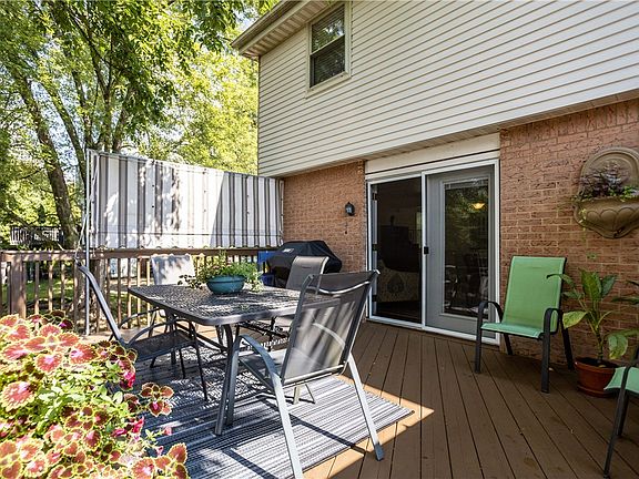 Welcome to 9849 Tomahawk Trail, a well maintained all brick 1/2 duplex townhouse with no HOA fees. Hardwood floors throughout the open concept first floor, eat in kitchen with pantry, dining and living rooms. Sliding glass doors lead to a large deck with side awnings and trees for privacy. Steps from the deck take you down to a brick patio lined with ferns, flowers and shrubbery. Master bedroom with on-suite, two additional bedrooms, bath, plenty of storage complete the second floor. Finished carpeted game room or fourth bedroom in the walk out basement with a single car garage. All rooms recently painted and window treatments included. One year home warranty. 1/2 Duplex