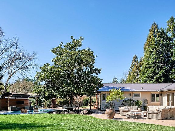 Gorgeous, sprawling four bedroom, two and a half bathroom single story rancher on a quiet desirable Alamo street. Enter through the beautiful front door and you are welcomed by high ceilings, endless natural light and a modern yet rustic feel throughout. The open concept floor plan includes an updated gourmet eat-in kitchen, family room and separate living area with fireplace. This wonderful home was designed to invite the outdoors in with access from most areas to the beautiful outdoor spaces. There are three guest bedrooms and an updated hall bathroom with dual vanities, shiplap walls and modern tiles. The primary suite has a peaceful setting with views and access to the beautiful parklike backyard. This home is tranquil and inviting as well as being an entertainer’s delight with all the special areas of the yard. The spectacular backyard has a gorgeous pool, large lawn area for children or pets to run and multiple sitting spaces each with its own unique feel. All of the mature landscaping is watered by a well on the property. The home has several high end Ipe decks and great outdoor lighting throughout the property. There is a Control 4 system to operate the lights, music, pool and irrigation. For the quieter moments, there is a separate covered spa area with an outdoor shower. There is a newer upscale metal roof, hardy backer siding with copper flashing, two car garage with an oversized driveway and electronic gate that opens to the backyard for RV/boat parking. This wonderful home is truly one of a kind.