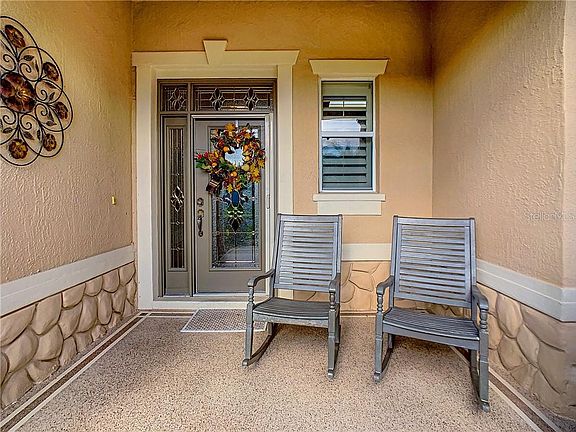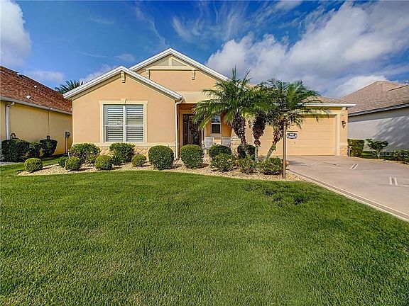 You are going to feel at home here from the minute you walk through the door! This lovely Somerset Model has an exceptionally large expanded garage and features an open floor plan with tray ceilings, custom baseboards, and plantation shutters to set off the fine details of this home. You are going to love the beautiful Laminate flooring throughout the main living area with a freshly painted open floor plan. Kitchen provides plenty of storage with beautiful cabinetry with pullouts and granite countertops. The Master bedroom with a tray ceiling has new carpet an en suite bathroom, and closet with organizers. Laminate flooring in the second bedroom with no closet. The front bedroom hosts a beautiful Murphy bed and built-in desk, with new carpet. Not only is this well-kept home a find, but it sits on the perfect lot with a cul-de-sac behind which provides privacy and no kissing lanai. The extremely comfortable enclosed lanai with newly installed (June 2020) mini-split air provides for year-round enjoyment and the motorized awning (with remote) off the lanai provides shade but still lets in the light for those afternoons to relax after a great day of golf with friends. Hunter Douglas Blinds on Slider Doors leading to Lanai. Rinnai tankless water heater (2014) provided endless hot water without taking up valuable storage space in the garage. Whole house water softener and filtration system installed. Beautiful curb appeal with designer driveway, walkway, and entry. *GOLF CART INCLUDED! You will love the location of this home in the Village of Largo, with easy access to Lake Sumter Landing and Brownwood Paddock Square, in the best golf cart community around! We will see you here soon...