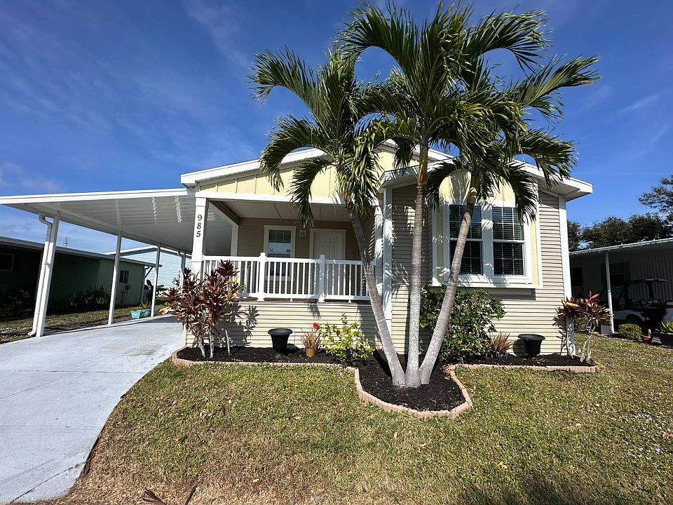 995 Montego E Venice FL 34285 Bay Indies 55+ Mobile Home Community This is a mobile home for sale in a lot lease community. This beautiful spacious 2015 Palm Harbor home is a 2 BR/2BA and comes partially furnished in the Bay Indies Resort Community. This home has a split plan and is great for entertaining guests. The large beautiful kitchen is open to the dining and living area with high ceilings and recessed lighting. The kitchen has beautiful wood cabinets and newer appliances. The raised countertops and a breakfast bar to add more seating. The dining room has a beautiful built-in hutch and is open to the kitchen and living area. Tucked in an alcove is the washer and dryer and a pantry. The large living room is spacious, has high ceilings, light and bright and is open to the dining room. This home has luxury plank flooring throughout the home. The master bedroom is large enough for a king bed and has an ensuite. The beautiful bathroom has a single single raised vanity, walk-in shower and large walk-in closet. The guest bedroom is in the front of the home and has a double deep closet. The spacious guest bathroom has a single sink raised vanity, storage and tub shower combo. This home has a two car carport with plenty of room for entertaining outside and a large shed attached. The shingle roof is new and AC is 2015. The front of the home has a covered front porch for enjoying the Florida Sunshine. This home is a must see and it is priced to sell at $79,900 The current lot rent is $1320.00 per month and this includes trash, lawn maintenance, 3 pools, two clubhouses with associated activities. The final actual lot rent TBD by Bay Indies Property management. This home can be rented for a minimum of 30 days and the tenants must have park approval. The Bay Indies Community offers many amenities and outdoor activities to include pickleball, bocce, shuffleboard, kayak launch and three heated pools. Over 80 clubs and organizations. Bay Indies is Pet Friendly and golf-cart friendly. Bay Indies is close to many beaches, nice restaurants, and a new medical hospital. You can enjoy boating and golfing within a few miles. Come check out this beautiful home on 985 Montego E in the beautiful 55 + mobile home community of Bay Indies. Florida MH Sales, LLC cannot guarantee or warrant the accuracy of this information, measurements or condition of any property. Buyers are encouraged to perform independent due diligence. The measurements are approximate and the lot rent is subject to change.
