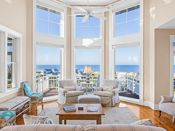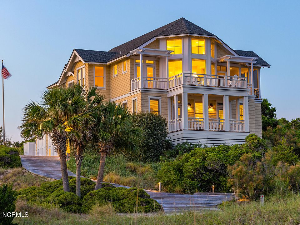 Crowning Bald Head's Dune Ridge, this 5 BR, 4.5 BA reverse floor plan Peter Quinn-designed sanctuary delivers quiet while taking optimal advantage of its location to capture views from every angle-serene Maritime Forest perspectives and expansive azure Atlantic panoramas. Off the spacious foyer, a cozy TV den (perfect room to convert to the 5th BR) accesses this level's shaded back screened porch. Beyond, a Full suite-with its own private bath-also provides entrée to the porch. Around the corner, a bright Twin suite sleeps two and supplies an ensuite with tub as well as a door to the ocean-facing front covered porch for seascapes inside and out. Next door, a large, sunlit corner Queen suite, with a sitting area, delights with two sides of water scenes as well as front porch entry. Halfway up the gleaming hardwood stairs, a window bench reading nook, w/ built-ins, boasts more glinting ocean prospects. The sun-drenched top floor's open floor plan, soaring ceilings & glassed bay walls showcase the surf's majesty from the Shoals far down South Beach. Savor those vistas warmed by the gas fireplace in the generous living space or outside while relishing briny breezes on the top floor's sun deck. Nearby, a dining porch lets you feast alfresco but you also have the option to eat inside while still observing the breakers. The considerable, multi-chef gourmet kitchen features yards of quartz prep space, a breakfast bar seating 5, a built-in desk, a wine cooler and tons of storage. Off it are the laundry and the top level's back screened porch-perfect for nature-watching. Down a hall is the powder room & the corner Queen Owner's suite which furnishes a sitting area, private screened porch egress & a pampering bath w/ jetted tub, water closet, dual vanity & tiled shower. Convenient to the beach, clubs, & shops; adjacent to a donated lot & conveying with two golf carts (a four- and a six-seater), this home also offers a Full BHI Club membership for separate purchase.