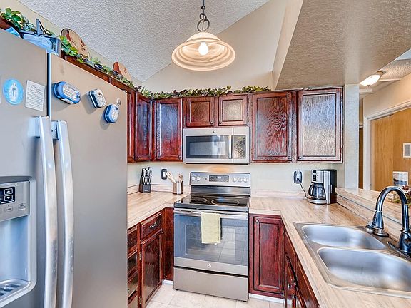 Wonderful top floor unit with vaulted ceilings and lots of windows. Condo has one car detached garage plus one reserved parking space. West facing unit and balcony with views of the mountains. All new kitchen appliances. Cute dining area with sliding glass door to deck. Two bedroom suites with large closets and direct access to the bathroom. One bedroom has vaulted ceilings. Updated bathroom with double sinks, separate room for shower/toilet, and tile counter, floor, and tub surround and updated fixtures. Newer carpet and windows. Complex has its own community pool. Close to trails and main reservoir. Garage is #F102