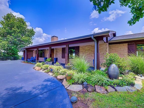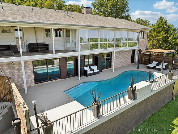 BEAUTIFUL lake property in the town of Westport, just 20 min from downtown Tulsa. Completely renovated. Pro craftsmanship, Pro Design, Pro material choices. Year round unobstructed, breathtaking views & nice, paved roads to property. Lake views will not disappoint! Two pics (one front/one back) are obviously taken from above to provide perspective of the bluff & home positioning relative to the lake. Other pics showcasing the lakeview are taken from inside the home, right thru closed windows. Remaining lakeview pics are taken from the same spots you will be relaxing, such as in the pool or sitting on a deck or patio. You will have these lake views from inside 3 common living room areas both upstairs & down, from inside kitchen, dining, master, guest bdrm, gym/shop, office, covered patio, pool area & more. Pics of storms, rainbows, moon etc. were taken from inside the main living area inside the home right thru the closed windows. The outbuilding (currently a gym) is 1000 square feet, and completely renovated. This outbuilding is in addition to the 5406 sqft within the main home. You're getting over 6400 square feet of indoor living space. The outbuilding has lakeviews, foam insulation, heat/air, huge insulated picture windows, & separate electric drop/panel to ensure plenty of amps. Master has 2 walk in closets, double vanities, ¾ glass walk-in shower & sep. tub. Guest bdrm on main floor also has a full bath. The pool is 10k gallon, heated, and only a few steps out any one of the three downstairs glass doorways. Zoned heat/air, zoned hot water. Wired for LAN high speed Internet. Windows, doors, motion hardwired security. Wireless glass break add ons also, but all security stays with home. Full of quality features and craftsmanship you just don’t see any more like hardwood solid interior doors, full brick, extra retainers beyond structural requirements, much more. Safe room hidden inside. Updated retaining walls. This home is a one of a kind treasure, don’t miss out.