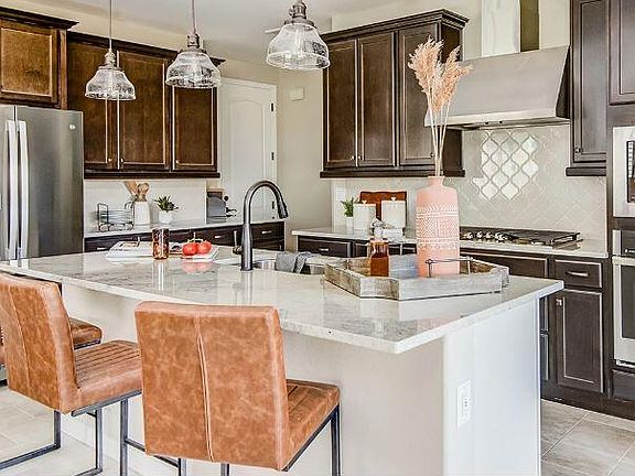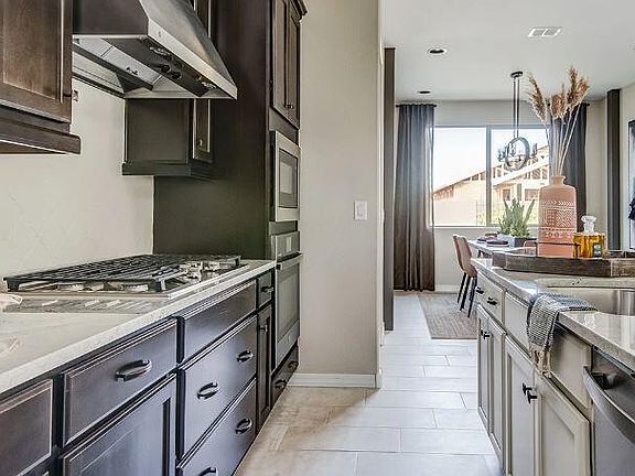 This beautiful Mystic Model has a dreamy, oversized backyard with an amazing pool, pergola, extended patio and a built in BBQ. This backyard is ready for you to entertain or just relax in your private oasis. Flex your hosting skills from your gourmet kitchen featuring 42'' Kona maple cabinets and upgraded island with chiffon color cabinets, built in wall oven and micro, gas cooktop, and granite countertops throughout your home. This model offers elegant design features throughout, including a glass den with built in shelving, beautiful 12'' X 24'' tile throughout with upgraded carpet in the secondary bedroom, 12x24 tile surrounds in your extended walk-in shower, and tons more custom features