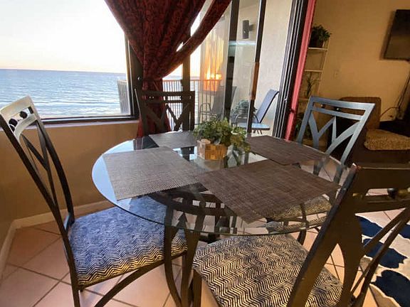 C floor plan set up really cute! Besides the phenomenal, panoramic view, this beachy getaway has many updates including newer custom cabinets in the kitchen and bathroom, new granite countertops, and new plank style tile in the bedrooms. This unit conveys fully furnished and is ready for you to enjoy or to rent out!