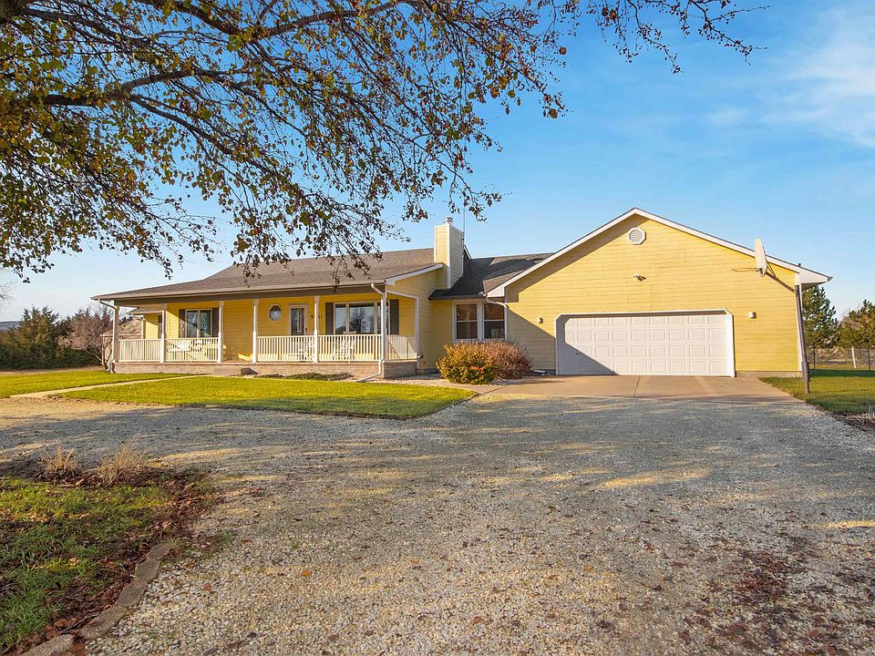 Stunning farmhouse-style home in Peck! This single family home with the majestic sloping cathedral roof, elegant full covered front porch, and open concept floor plan with glistening hardwood floors is now ready for its new owners! Live in a large house boasting 3 beds, 4 baths, 4+ car garage including the detached outbuilding, and over 3,279 sqft of livable interior area out of 5 acres. The great room has a fireplace and is bright, thanks to large picture windows flanking both sides of the room. The U-shaped kitchen features a useful center island. The formal dining space is situated by a bay window, affording you with majestic views of the outdoors. The spacious master bedroom enjoys a cathedral ceiling and its very own full bath and walk-in closet. The rest of the bedrooms are carpeted, with their own closets, and common access to full hall baths with tubs. The last feature of the main level is the sunroom or screened-in porch, where you can enjoy unobstructed outdoor views while staying in the enclosed section of the home outside the dining area bay window. The finished basement downstairs provides extra space with its full-span open area family room, bonus rooms you could use as sleeping quarters, a full bath in the basement, and a 40x8 storm shelter useful for erratic Kansas weather. Other features of the home are the oversized garage with built-in cabinets for storage and attic storage, 8Kw integrated generator, irrigation system, two water wells, heated & cooled 32 x 38 shop, unlimited gardening area, and more! Fulfill your dreams of enjoying life in the countryside. Check out this beautiful, move-in ready home today. Call to schedule a private showing. Seller has recent inspections for: water test, septic, lagoon, termite and radon and made repairs to include: new septic tank, reshaped and fenced lagoon, preventative termite treatment, radon mitigation system installed- documentation and invoices in Documents.