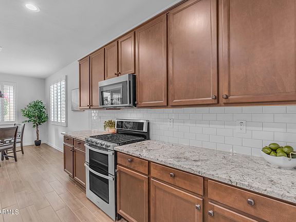 Discover elevated living in the heart of Eastmark with this beautifully upgraded single-level home. Featuring three bedrooms and two bathrooms, this residence showcases thoughtful enhancements throughout—including wood-look tile flooring, granite countertops, and a gourmet kitchen equipped with a gas stove. The open-concept layout is anchored by a modern tiled fireplace, creating a warm and inviting atmosphere perfect for both relaxing evenings and entertaining guests.