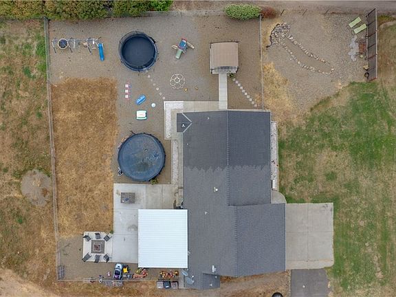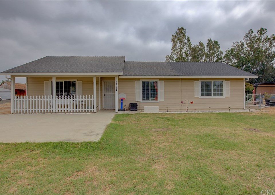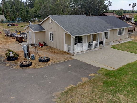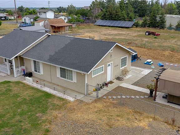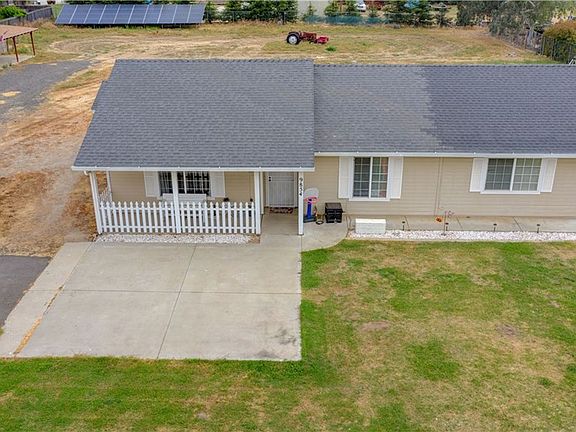 Ranchette home is 1453 sq ft with 3 bedrooms, 2 bathrooms built in 1996 on 1 acre with cozy front porch. Home features open floor plan with stainless appliances in kitchen, laminate flooring in main living space. Large master bedroom and master bath features jetted tub with separate shower and outside access leads to your spa. French doors off kitchen nook lead to large covered patio and fire pit great for entertaining and relaxing. Back yard is fence in and ready for kids with trampoline, above ground pool and swing set with plenty of space to play. Property is fully fenced with electric gate features garage and shed for plenty of storage. Solar is paid in full and included. Permitted for second dwelling with separate utilities.