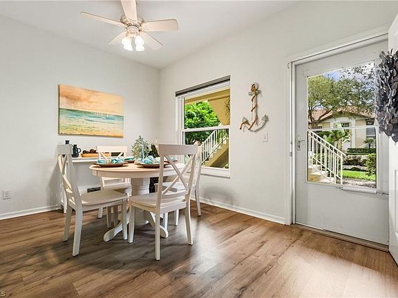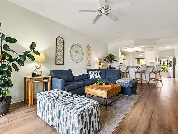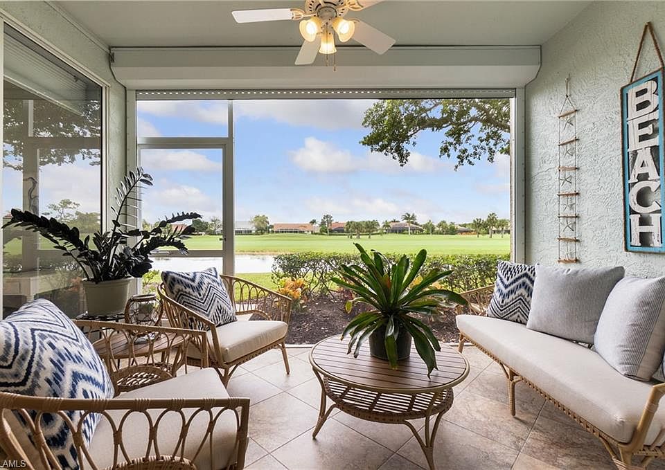 Wake up to sweeping golf course views and end the day with majestic sunsets from this highly desirable first-floor, west-facing 2-bed, 2-bath condo at the Golf Condos in exclusive Spanish Wells Golf & Country Club. This inviting & impressively updated condo features a radon mitigation system, fresh paint, laminate flooring throughout, newer appliances, and updated impact-resistant windows with custom window treatments. It also includes roll-down hurricane shutters on the lanai, a newer air conditioner and water heater for enhanced comfort, and spacious 9-foot ceilings that create an open, airy atmosphere. Enjoy breathtaking sunset views from your screened lanai overlooking a tranquil pond and the rolling greens. The property includes a one-car garage, an exterior parking space, and golf cart storage. Perfect for your rental portfolio, seasonal getaway, or forever retreat. Ideally located minutes from sun-drenched Gulf beaches and vibrant entertainment and dining at Mercato. Experience the charm of this meticulously maintained coastal condo in an unbeatable location. Schedule a showing today!