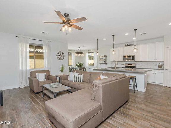 You'll love this beautiful, highly upgraded home in family-friendly Eastmark that offers 3 bedrooms & 2 baths in 1564 SqFt. Open great room floor plan with split bedrooms. The kitchen has 42'' white cabinetry, Silestone counters, stainless appliances & cabinet hardware, walk-in pantry, and island with breakfast bar & pendant lighting. Sliding doors lead out from the dining area to the covered patio & low maintenance backyard with artificial turf. The master bedroom has an en-suite bath with dual sink vanity, tub/shower combo & walk-in closet. Other features: 2 car garage with keypad entry, paver driveway oversized laundry room, wood-look tile floors in living areas, designer light fixtures and much more! Fabulous community amenities include the Great Park, resort-style pool, toddler pool, Orange Monster climbing park, family recreation center; and great schools, dining, and shopping nearby. See today!