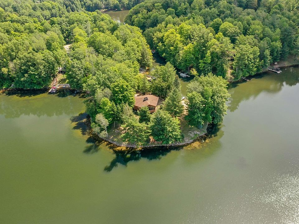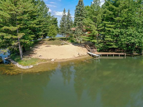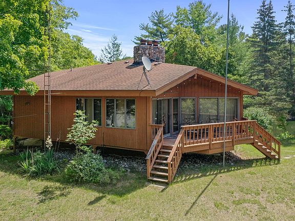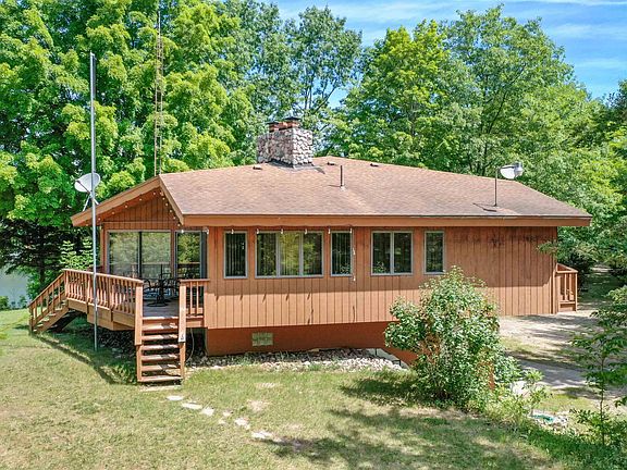 Welcome to a peninsula of paradise on private Lake Miramichi. This peninsula lot with 610 feet of very private frontage was one of the first lots sold and has been in the same family since the 60's. The owner custom designed an architecturally unique home to capture the 360 degree views! The home features 4 bedrooms, 2 baths, vaulted ceilings with great lines, and an impressive stone fireplace. There are amazing views from all rooms, facing the water in multiple directions. There is a deck off from the living area, as well as a private deck off the primary bedroom, both with water views. Lake Miramichi is 205 acres and located in the countryside of Evart MI, conveniently situated in central northern Michigan. This is truly a rare find one of a kind property and home being offered for the first time! No short term rentals allowed in this development.