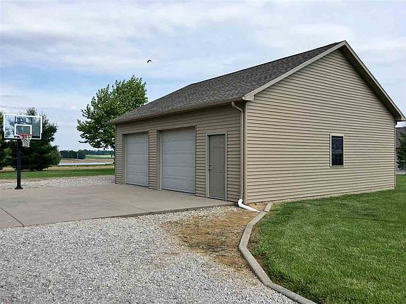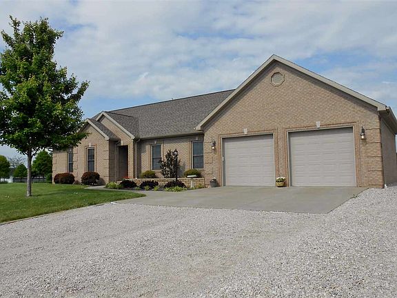 Call Haubstadt home in this exceptional 3-bedroom, 3.5-bath, brick ranch with full basement and 4-car garage! You will love this jewel, situated in a scenic country subdivision on a 1-acre lot with 27 x 30 detached garage. The thoughtful plan delivers a large living room accented with decorative bead board, and a beautiful kitchen featuring cabinetry you will love with large pull-out drawers, Brazilian Teak hardwood floors, a huge breakfast bar, and open dining area. The master bedroom enjoys a walk-in closet and accommodating full bath with jetted tub/shower and linen closet. Both the additional 2 bedrooms are nice-sized and share a hall bath. It will be easy to expand abundant living space in the poured-wall basement, where a full third bath is finished and the walls are studded for future family room and bedrooms. A spacious laundry room is convenient to the over-sized, extra deep, attached 2.5-car garage and has a half-bath. The covered rear porch, with a beautiful view, will make a great space for cookouts, entertaining and watching sunsets, and there is a detached 27 x 30 garage with an 8' door, concrete floor, electric, and work bench. Per seller: windows in garage and west side of home '12, bead board accents '15, wood floor '08, roof '12, siding on detached garage '12, sliding door '12, furnace and air heat pump '14, water heaters (2) '13 & '15.