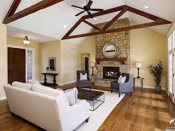 Beautiful Home! Ideal Setting in Red Tail Ridge Rural Subdivision on approximately 3.8 acres. Elegant one level living. Lots of natural light. Stunning living room with vaulted ceiling and stone fireplace. Luxurious Master bedroom suite with jetted tub, dual sinks, and large walk in closet. Dream eat-in-kitchen with island and see through fireplace. Lawrence Schools. Just a few minutes from Lawrence & K10 on paved roads. Finished daylight basement. Move in Ready!