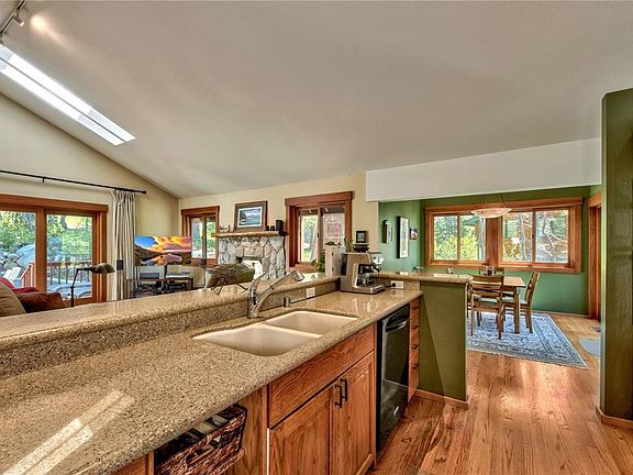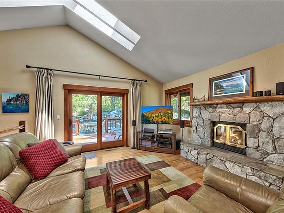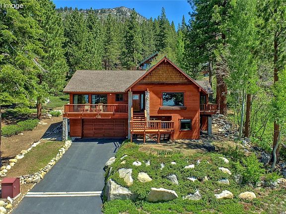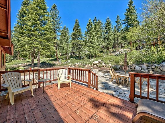 Comfortable mountain living and well maintained home. Exceptional curb appeal, Redwood siding, beautiful Lake views and abundant outdoor living including two Southern facing Redwood decks, a recently finished backyard lounge & patio area with level & spacious yard. The flowing creek and surrounding US Forest Service lots create a sense of peace and privacy. Open floor plan for easy living and generous spaces for entertaining and relaxing. Two living areas, modernized galley kitchen, Silestone counters breakfast bar, creek side dining area, Lake view deck & expansive backyard. Completing the upper level are the Primary suite, two bedrooms w/shared bath & laundry room. The lower level daylight basement is an incredible flex space with separate entry, ideal for a guest room, home office or gym, includes closets & a full bathroom. Two car garage & sunny driveway for additional parking. Located in upper elevation Apollo neighborhood connecting with nature & close proximity to hiking trails.