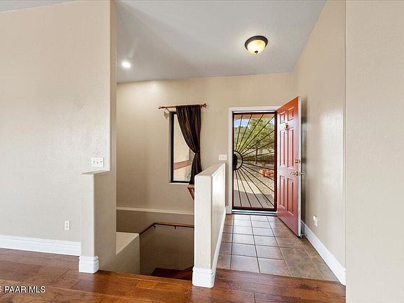 This stunning property offers breathtaking panoramic views of the valley floor, Mingus Mountain Range, and Glassford Hill from the moment you step inside. The main level showcases an open great room concept with vaulted ceilings, abundant natural light, and a beautiful gas fireplace accented by a custom shiplap hearth. The kitchen features granite countertops, a 5-burner KitchenAid gas cooktop, solid wood stained cabinetry, and a walk-in pantry, while the spacious dining area nearby takes full advantage of the same incredible views.The primary bedroom welcomes you with a double-door entry into a generous space. Behind a barn door, the ensuite bathroom offers a dual sink vanity with granite counters, a tub-and-shower combo, and a walk-in closet, all illuminated by a skylight. Two additional bedrooms on the main level each feature vaulted ceilings, mirrored slider closets, and decorative shelving. This level also highlights hardwood engineered-wood flooring, raised panel interior doors, and a guest bathroom with granite counters and a skylight. An expansive wraparound deck provides the perfect outdoor entertaining space, ideal for grilling and enjoying the sweeping views.The lower level extends the living space with a family room for added entertainment, a wet bar/kitchenette that could serve as an in-law suite, two more bedrooms and a bathroom, and utility room that would make the ideal workshop or craft room.Outdoors, the terraced backyard creates usable flat areas with artificial turf, peach trees, and a storage shed. RV parking with 30-amp power and a sewer dump sits conveniently on the east side of the home. Additional features include a two-car garage with a new overhead door, a Wi-Fi-enabled opener, and a 50-gallon hot water heater.With its thoughtful layout, versatile living spaces, and breathtaking views from nearly every angle, this property is a true gem. It's a home designed for both everyday comfort and unforgettable gatherings.