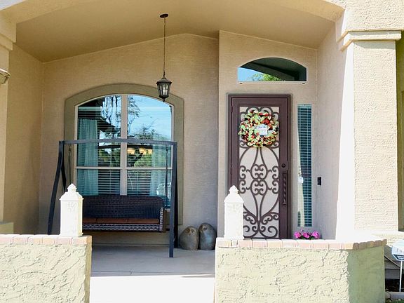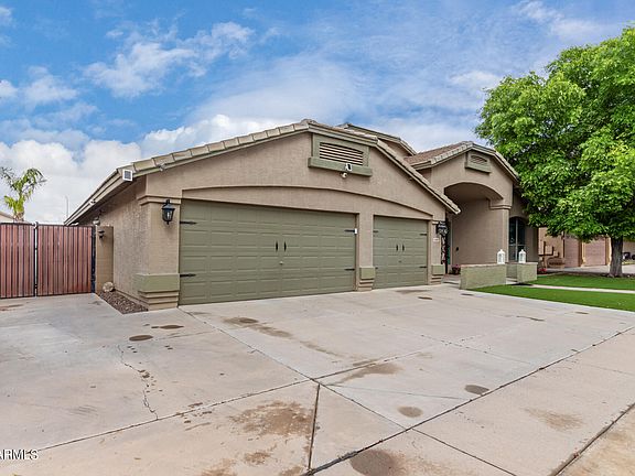 Gorgeous single level home with great curb appeal with artificial turf, mature shade tree, and planters. a paver sidewalk to lead you to the front covered patio/sitting area with pony wall, Double gate, 3 car garage, extended concrete for additional parking. Notice the newer, dual pane, low-e, tinted windows. Sunscreens off to allow more natural light. Enter the front through the impressive decorative First Impressions Iron Security Door. Discover an impressive interior offering soft carpet in the living areas and bedrooms. Striking vaulted ceilings, designer color palette, gleaming handscraped laminate wood flooring in other areas. Large Formal Living Room and Formal Dining Room with a creatively designed tray ceiling with custom grapevine mural. The well-appointed kitchen boasts MORE two toned wood cabinetry with custom paint and door hardware, undermount lighting, sleek granite counters, stylish chevron designed tile backsplash, black Stainless Steel appliances, undermount single basin granite composite sink, & a large extended island equipped with a breakfast bar with useable cabinets on both sides. Large walk-in pantry. Multiple planter shelves and wall niches to show off your decor. Eat in kitchen with a Bay Window. This is the heart of the home! This is the Great Room concept at its best. The Kitchen opens up to the Family room with a Wood accent wall and a gas fireplace with sitting height hearth, framed in a neutral colored tile. The serene main retreat showcases private outdoor access, an immaculate ensuite with dual sinks, with a make-up vanity, a jetted garden tub, separate shower, and water closet. A walk-in closet. Secondary bedrooms are good sized and one features a wood accent wall.