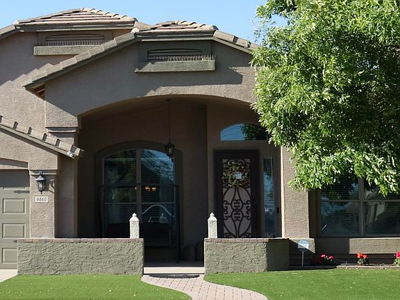 Another bedroom has a unique footprint which makes it feel like a second primary (minus a private bathroom.) The Guest Bathroom is a split entry bathroom. It has dual sinks and a garden tub/shower combination. Host memorable get-togethers in this amazing backyard, with multiple entertaining zones. The patio pavers expand on the extended patio area. Don't miss the extra seating area on the West side of the home to enjoy the custom painted floral block wall. This spacious Paradise of a back yard includes a sparkling, private, play pool with a peaceful sounding water feature surrounded by a custom tropical scene. Misting system on back patio. Artificial turf for year round green grass, planter bed, and three citrus producing fruit trees (pink grapefruit, tangelo and an orange tree) This is an original owner who has loved and maintained this home for years.