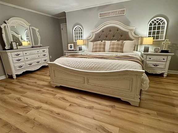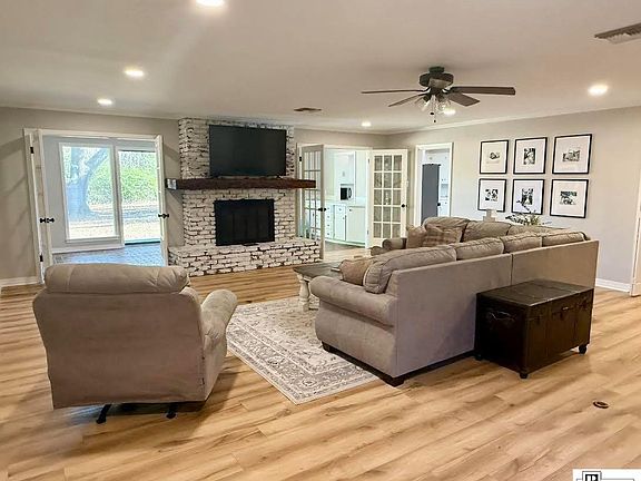 Beautifully renovated farmhouse~style home offering 4 bedrooms and 2 baths with almost 2700 heated square feet of living space. Exceptional curb appeal welcomes you with freshly painted white exterior brick, new shutters, and a 3~year~old architectural roof, all situated on 2 scenic acres with mature trees. There is a large metal parking shed, outbuilding, and small metal gazebo to remain. Step inside to discover fresh paint throughout in popular airy tones and new luxury vinyl flooring. The spacious living room is ideal for entertaining, featuring a cozy whitewashed brick fireplace with a TV mount above. This inviting space opens to a bright sunroom showcasing brick floors, a wet bar with a pass~through to the kitchen for easy serving and windows and a glass slider overlooking the picturesque backyard. The generously sized kitchen features painted white cabinetry, brick flooring, a newer dishwasher, and the original vintage stove\oven that perfectly complements the farmhouse character. There is plenty of room for a breakfast table, plus there is a separate dining room too!! All of the bedrooms are nicely sized with the primary featuring a walk~in closet and private bath. Both bathrooms have been completely and beautifully renovated with shiplap walls, white subway tile, showers and tub, new fixtures, lighting, vanities, mirrors, flooring, and toilets. Additional updates include a new HVAC system and a new tankless water heater..