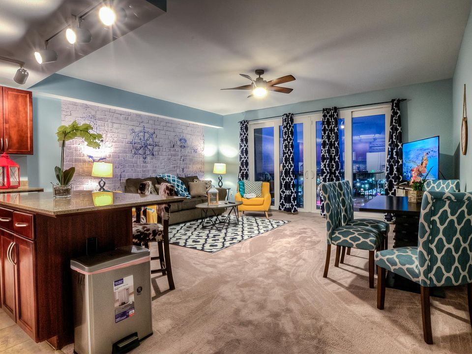 Fantastic remodeled unit in Laketown Wharf . Fully furnished, W/D. All utilities included, but electric. Available now. Available for summer rent as well - May - August at $3,000.00/month. No smoking and no pets. First last and security deposit required to move in. Call for details and showing . DETAILED DESCRIPTION: Completely Remodeled and Beautifully Furnished Condo, located within a short walk to the beach. Lake town Wharf offers THE Resort style vacation, from the five unique pools, 52,000 square feet of lakefront boardwalk, a fully equipped fitness center, covered parking, miniature golf, an on-site market/bistro, on-site dining options and flexible meeting spaces for conferences, to weddings and other group functions. There is really no reason to leave, other than the beach experience you can find across the street. Phenomenal setting offering panoramic elevators, you cannot find anywhere else, heated pools, kiddie pools. Vegas style fountain show every night, you can enjoy from the privacy of your own balcony! Tenant responsible for Electric
