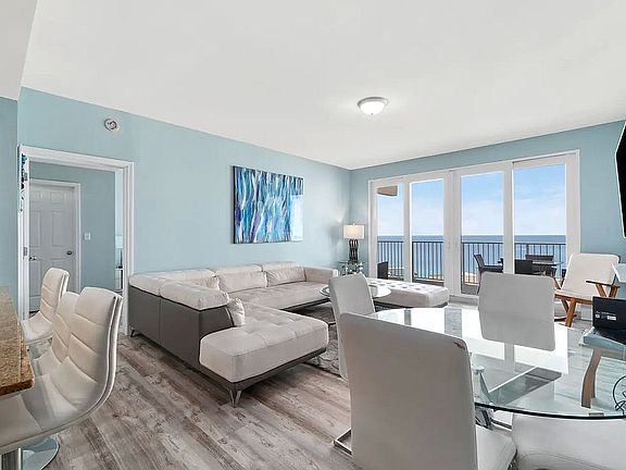 A fully furnished spacious HIGH FLOOR unit on the 18th floor with wonderful beach view to relax and enjoy your luxurious Laketown Wharf Resort vacation! This is where you want to be! Located right in the heart of Panama City Beach, close to restaurants, bars and shopping. This is NOT just a condo, it's your endless resort vacation in the Laketown Warf Resort. The resort has 5 swimming pools, gym, restaurants and several outdoor areas for you and your friends and family to enjoy. This unit sleeps 6-8 with 4 beds spread over 2 bedrooms and additional sleeping accommodation is provided in an alcove with a set of bunk beds. Beautifully decorated with lots of attention to detail and comfort. Recently renovated with LVP wood floors throughout, fresh paint, white cabinets, Granite countertops and new kitchen appliances. Has been be an amazing rental income source.