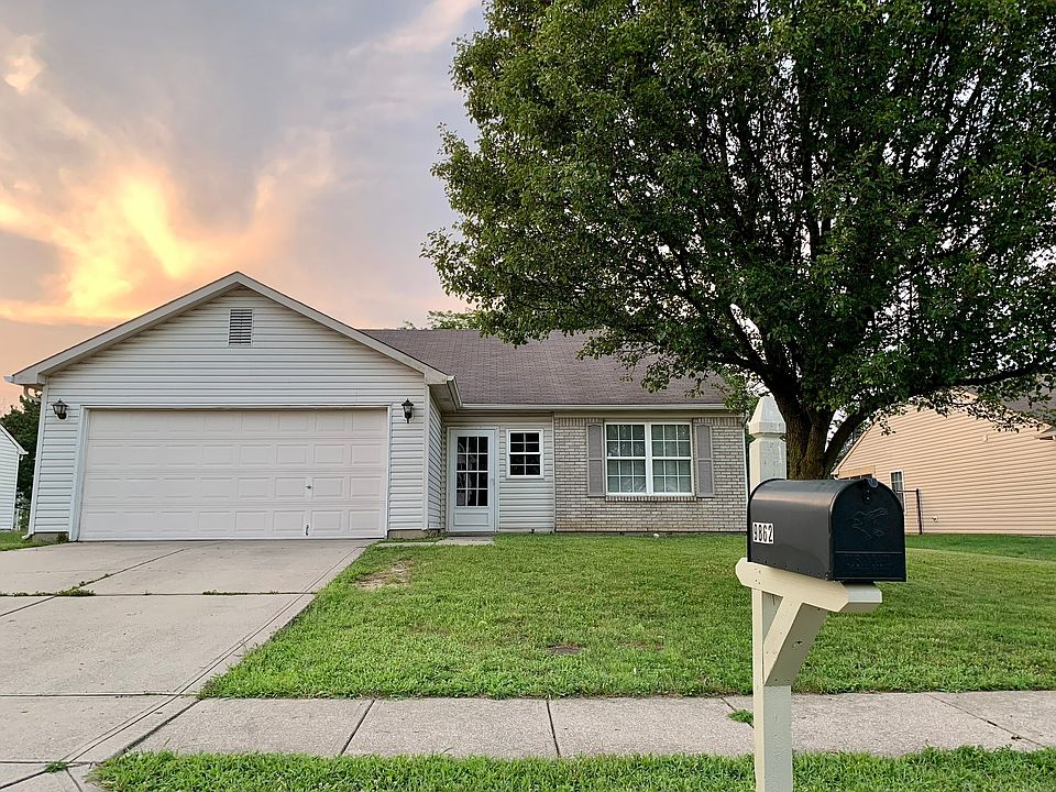 1240 square foot home with eat-in kitchen, stove and refrigerator stay, washer and dryer stay. .Fenced back yard, 2 car garage. the 2 non-primary bedrooms have new laminate flooring. Living Room is spacious. Super convenient location close to IU West, restaurants, shopping and parks. All 3 bedrooms have walk-in closets. Kitchen has breakfast bar. Total electric. Laminate floors throughout. Small front entry enclosed porch! Avon Trails has a community swimming pool and a large playground. This is a very basic floorplan, but the mechanicals are newer and there are many possibilities to "make it yours"! One of the best values for a 3 bedroom home in Washington Township!