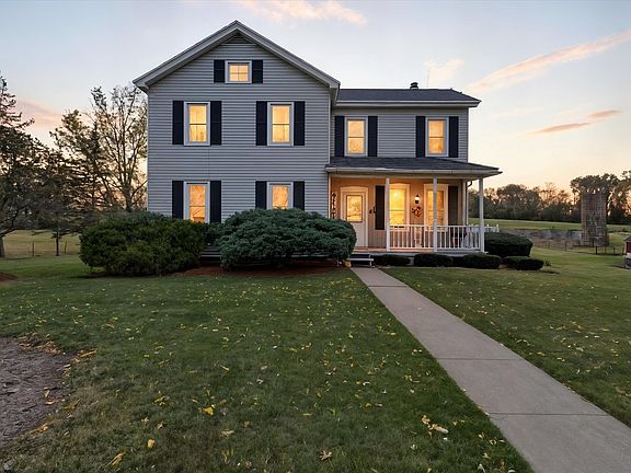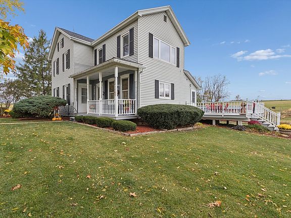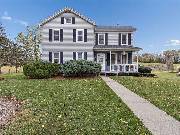 Welcome to 23 acres of rural paradise, offering a harmonious blend of productivity and pastoral charm. This property features approximately 10.5 acres of tillable land and 13 acres of fenced pasture-perfectly suited for cattle, horses, goats, sheep, pigs, llamas, and poultry. The classic two-story farmhouse offers 2318 finished sq ft of living space that includes 3 bedrooms and 2 full baths, with the primary bedroom and one full bath conveniently located on the main level. Inside, you'll find a spacious country kitchen with original hardwood floors and an abundance of natural light pouring in through numerous windows, many of which are newer replacements. The family room showcases a stunning floor-to-ceiling brick wood-burning fireplace, creating a cozy focal point for gatherings. Step outside to enjoy the covered front porch or entertain on the expansive 17' x 31' deck overlooking the rolling pasture. Multiple outbuildings provide flexible support for animals, storage, or hobby projects. Blend of productive farmland and fenced pasture for immediate agricultural use. Potential uses include small hobby farm, livestock operation, equestrian property, or recreational country retreat. A rare opportunity to own a working piece of countryside where timeless farmhouse character meets practical farmland and fenced pastures-ready for animals, crops, and a life lived outdoors.