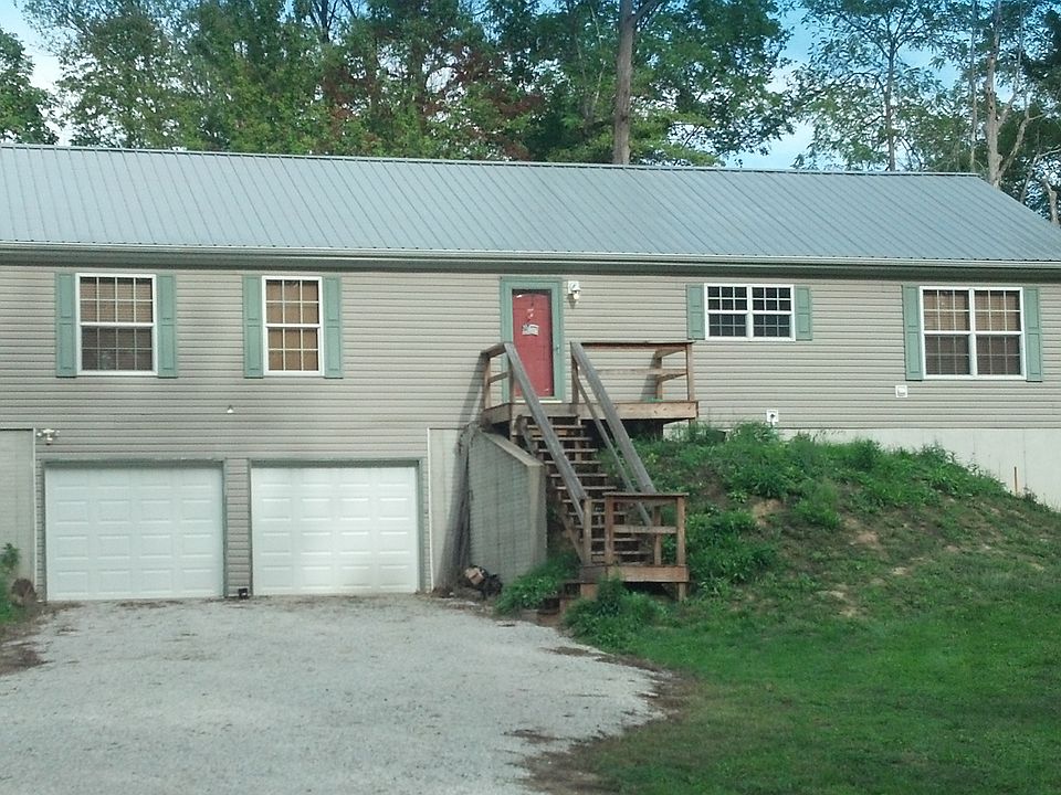 Seclusion and privacy are awaiting you here in this beautiful home. Open concept floor plan, large gorgeous kitchen with appliances, 3 large bedroom w/lg closets. Split floor plan. View from the deck of woods is amazing. Full unfinished walkout basement waiting for finishing touches (could add more bedrooms) Built-in 2 car garage. Easy to maintain laminate flooring and newer metal roof. All situated on 4 acres. Added bonus is wood heat, as well as electric forced air furnace.