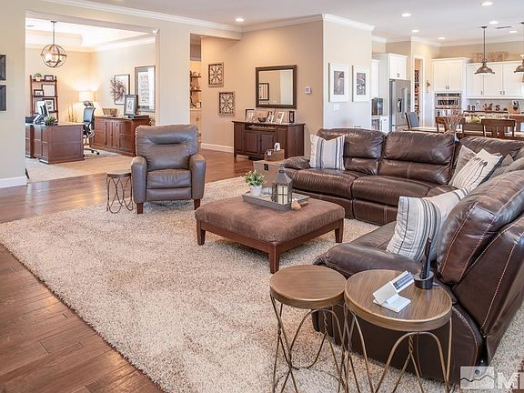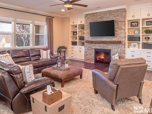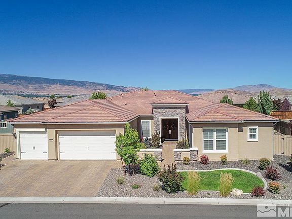Estates at Saddle Ridge masterpiece. Desirable Wilshire floor plan. This home is loaded with upgrades. Random-plank engineered hardwood flooring throughout living areas. Upgraded white MasterCraft Lancaster maple soft-close cabinetry and dovetail drawers. Kitchen features extended island with extra cabinets, apron-front stainless steel sink, granite counters, hood vent, beverage fridge, pebble icemaker, coffee station, and a western slider opening to an outstanding extended covered paver patio., Homeowners spent over $200,000 in timeless upgrades in 2017. Think about how much the cost for the same upgrades has increased in the last 8 years! Quite a bit. Massive primary suite features slider to covered patio, custom closet system, soaking tub, and upgraded counters and cabinets. Floor-to-ceiling stone fireplace with blower and built-in cabinetry in great room. Upgraded Shaw carpet in bedrooms and office. Wood blinds and motorized roller shades. Home has been equipped with a whole-home transfer switch for a generator. Large three car garage with built-in cabinets and epoxy floors. Backyard also includes water feature, accent lighting, lawn, and planter beds. 5.1 surround sound theater speakers remain with home. Sports court in spacious side yard. Saddle Ridge offers an outstanding community clubhouse with pools and hot tub; playground; tennis, basketball, and pickleball courts; tot lot; and a gym. Damonte Ranch has miles of wetlands trails and great proximity to Lake Tahoe, Mt. Rose Ski Area, shopping, job centers, and all the best recreation the Sierra Nevada range has to offer.