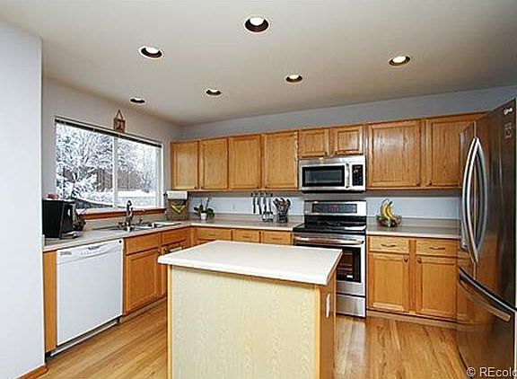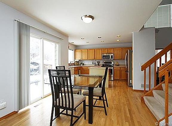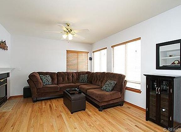 Looking for a four bedroom home in Highlands Ranch? Popular floorplan features four beds up plus a finished basement and no neighbors directly behind! Step inside onto the natural hardwood floors that extend from the vaulted living/dining rooms into the kitchen, eating space and family room that also features a gas fireplace. Bright kitchen has stainless steel appliances including smooth top range and microwave. There are also pull out shelves and a convenient island. Master bedroom has a private full bath with tile floors and dual sinks, plus a walk-in closet. Finished basement boasts a good sized rec area with french doors and a laundry room with tile floors. Enjoy the private backyard on the large deck!