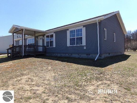 Hillside ranch style home with split floor plan this is a manufactured home with 6 inch walls drywall interior large kitchen with eating area, formal dining at end of living room, lots of kitchen cabinets and island. Main bath and 2 bedrooms at east end of the home. Master bedroom and private bath located on the west end. Nice open living room with slider to the back deck. Covered front entry porch and side deck. The 40 x 64 pole building needs major repair.
