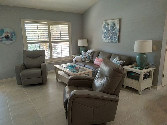 The soothing sound of the fountain combined with the lush landscaping is sure to set a relaxed mood each time you come home to this amazing 3/2 ALLAMANDA Designer home. Greet neighbors from the front porch or spend time on the rear lanai that has been expanded with an additional screen enclosure. Very nice curb appeal with painted drive, walkway and entry, curbing with shrubs, flowers and palms! Inside this popular “split” design you’ll find neutral colors, open concept living, and easy to care for finishes. The VAULTED CEILINGS make the room feel even more spacious! Beautiful new tile floors throughout including all bedrooms. The master suite features DOUBLE WALK-IN CLOSETS, DOUBLE SINKS and plenty of room for a king-size bed. The guest wing can be closed off for privacy with the pocket door and both guest bedrooms have closets. You’ll notice that the home has been meticulously maintained and was only used seasonally for many years. The Florida Room can be used as an office or another bedroom in a pinch. Recently painted walls inside and new epoxy paint on the garage floor and lanai. Kitchen and laundry brightened by newly installed solar tubes which also provide night lights in the evening. Plantation shutters in the living area. FOR SALE BY OWNER TO SAVE YOU MONEY! Great location right between the Lake Sumter and Brownwood Town Centers. Walking distance to the Bonifay Country Club, Golf Course and Pool. Close to Walmart and the Colony Shopping Center, the Bradenton, Captiva and Colony Rec Centers as well as the Sarasota Golf Driving Range. Very friendly and active neighborhood. Centrally located in the Village of Fernandina. Quick closing possible. Will work with buyer realtors. MAKE YOUR MOVE, CALL THE OWNER TODAY AT 434-258-7488!!