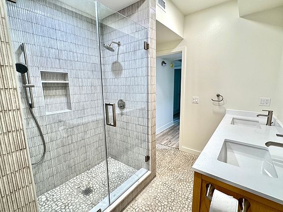 Down the hallway, you'll find two well-sized bedrooms, each with custom built-in shelving in the closets. The spacious bathroom features a dual-sink vanity and a large walk-in shower enclosed in glass for a spa-like feel. A laundry closet with washer/dryer included adds convenience and function.