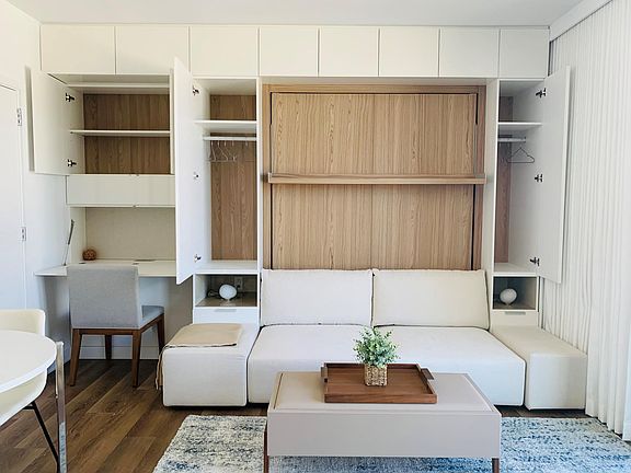 MUST SEE Aalii designer studio unit. Just 2 blocks from Ala Moana beach park, across from Whole Foods, South Shore shops, world-famous Merriman's restaurant, along with a long list of multi-ethnic food options all within close proximity. Catch a movie at Ward theaters across the street. Cool mountain breezes flow through the unit and enjoy the superior wider layout and patio. ORIGINAL-DESIGNED TURNKEY FURNITURE includes: Murphy bed with brand new Queen's size mattress, pull-out desk and smart cabinets, dining table and chairs, outdoor patio furniture, and TV stand. Large closet and additional closet space in smart cabinets. All inclusive bathroom and bedroom linens, and kitchenwares including utensils, pots, pans, and coffee maker. Make everyday living a permanent YEARLONG STAYCATION with a beautiful sunset sky lounge, rooftop fitness gym, yoga studios, and gorgeous entertainment rooms. Pool deck has multiple private barbecue areas, private entertainment rooms, children's pool, infinity adult pool, semi-private cabanas, and jacuzzi. IMMEDIATELY AVAILABLE for showing and move in. Tenant pays for electricity and basic cable. Water/sewer, parking and internet is included in the monthly rent. Tenant to pay Hawaii General Excise Tax. Renter's insurance required. No pets allowed. Tenant shall be responsible for electricity and cable. Water, sewer, and internet are included in the monthly rent along with 1 covered, assigned parking stall.