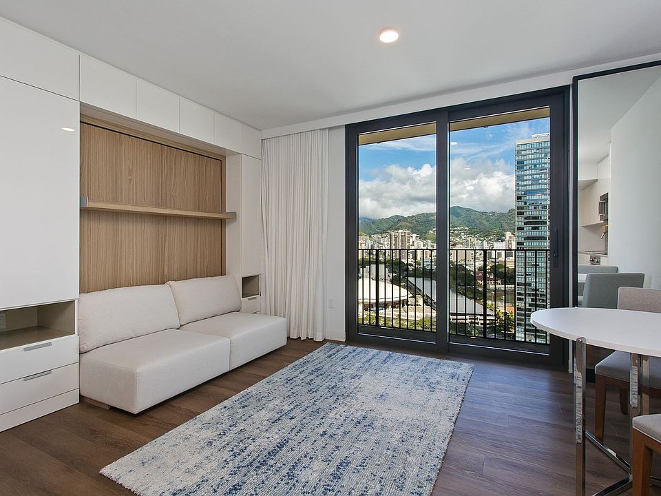 This modern studio at 'A'ali'i in Ward Village offers the perfect blend of luxury and functionality. Fully furnished with sleek, space-saving design, floor-to-ceiling windows with stunning city and mountain views, contemporary kitchen with high-end appliances, in-unit washer/dryer and central AC for year-round comfort. Enjoy the building amenities that include a pool and spa, fitness center, Sky Terrace with stunning panoramic views, co-working space and lounge areas. Moreover, enjoy the convenience of living in Ward Village where WholeFoods is a block away and array of shopping and dining is at your doorstep. Minimum one-year lease required, base rent + GET and utilities.