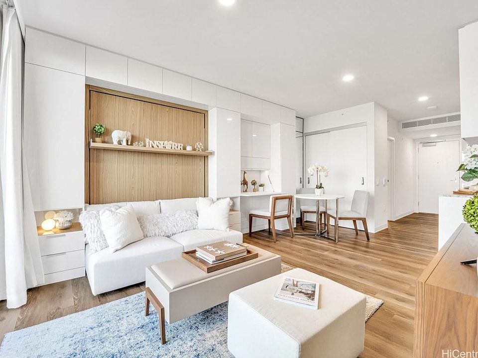 Welcome to your new home at 'A'ali'i, designed by award winning architect Solomon Cordwell Buenz. Partially furnished studio unit located in the tower of 'A'ali'i. These studios were designed to take advantage of smart, modular furniture and these modern pieces maximize space and create a more efficient living environment. Furnishings include a built-in murphy bed system/couch, desk, closets and storage. Natural stone countertops, Bosch kitchen appliances and Studio Becker cabinetry complete the luxurious look and feel of the kitchen. European porcelain tile in the bathroom and luxury vinyl plank flooring throughout. Kitchenware all included for your convenience. Lanai 42 is a one of a kind building feature in Ward Village, featuring a sunset sky lounge, outdoor fitness deck, rooftop fitness club, ocean view event spaces, dining room and yoga studio. The 8th floor recreation deck features a keiki splash and play area, pool and cabanas, indoor/outdoor event spaces, and barbeque areas.