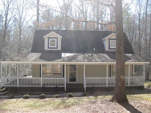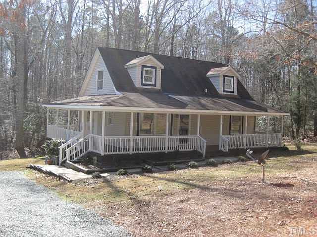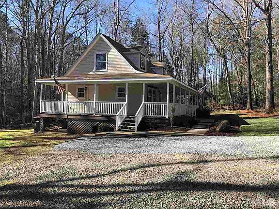 Country living on 3+ acres adjacent to State Park Land. Walking distance to the Haw River or minutes to Jordan Lake. Wrap around covered porch to enjoy the view of large hardwoods and pasture area. Upstairs is all spacious master suite: big walk in closet and huge fabulous bathroom. Downstairs living room, two bedrooms, plus sunny eat-in kitchen with pantry. Lots of storage in attic space.