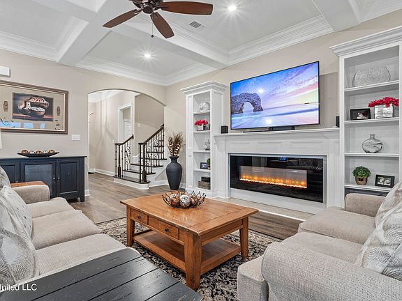 Welcome to this exquisite custom home nestled on a sprawling 1-acre lot right on the out skirts of Biloxi. As you step inside, you are greeted by a stunning foyer that seamlessly flows into the expansive open, split floor plan. Marvel at the 10 ft ceilings, intricate custom coffered ceilings, and elegant triple crown molding throughout. The home features 8 ft interior doors and bespoke built-in cabinetry with an electric fireplace, adding a touch of sophistication.
