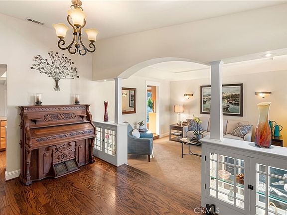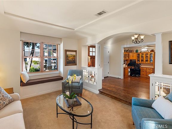 This is a fantastic opportunity to own this single-level, corner lot, craftsman-style home in one of the best locations in Huntington Beach, Shorecrest West. This property is turnkey, has been custom-remodeled, and is exceptionally well-maintained. If you have an eye for detail, this home is for you, from the craftsman woodwork to Baldwin hardware and Grohe fixtures. Upon entering this lovely home, you are immediately drawn to the beautiful wood floors and the open floor plan. From the formal entry to your left is a large office/ den with a ceiling fan and pocket solid wood doors; it could also be used as a formal dining room. To your right, you will observe the beautifully lighted display cases and an arched entry into the formal front room, filled with natural light from the bay window seat. You will see the unique coffered ceiling that adds to this home's many craftsman touches.