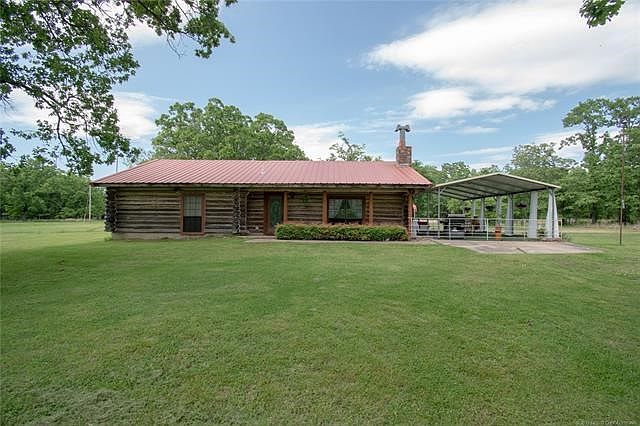 Gorgeous Custom Log Home on beautiful and peaceful 5 acres features 2 bedrooms, full bath, loft, and 2 car detached carport. Open floor plan. Living area includes vaulted ceiling and wood burning fireplace with blower. Spacious kitchen and dining room combo features built-in double ovens and vaulted ceilings. Master and secondary bedrooms include walk-in closets. Loft for office or additional bedroom. Exterior amenities include cover porch, 22 x 32 covered patio great for entertaining, and shed.
