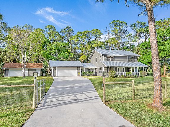 Situated on 1.2 acres in Jupiter Farms' sought-after East side, this property offers easy access to main roadways. The home boasts modern touches with a 2023 metal roof, updated interior, and freshly painted exterior. Step through the front foyer to find an office/den and a formal dining room seamlessly flowing into the kitchen. Connected to the kitchen is a family room adorned with a charming fireplace and built-ins. The updated kitchen has a spacious breakfast nook area. Accessible from the entire back of the home is a sprawling screened-in patio, extending the living and outdoor areas.This property features a detached 713 sqft garage, equipped with water and electricity, perfect for a workshop or potential barn conversion. Generator with Buried Propane and Hot Water Heater are 2023. The Easement on the side of the house offers extra privacy and could be used for riding horses in and out of the property. Proximity to the back entrance of Riverbend Park, with hundreds of miles of hiking trails and horse trails, adds to the appeal of this location. This property is zoned for Jerry Thomas Elementary School and Independence Middle School, making it an ideal choice. It also offers quick access to stores, restaurants, and major roadways.