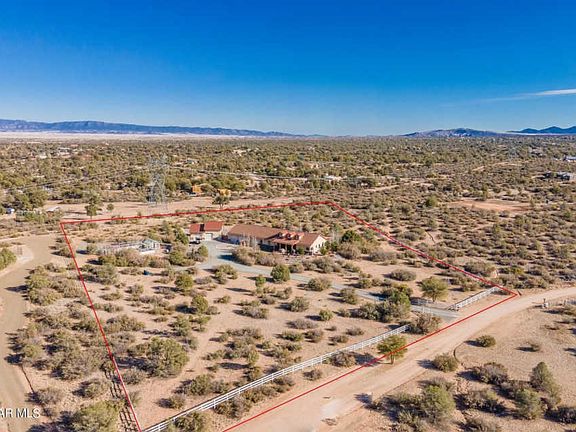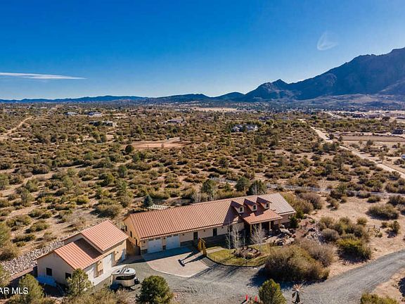 This serene property has just over 4 acres in the desirable 86305 zip code. A paver lined path leads you into the courtyard and expansive front porch with a tongue and groove wood ceiling and large wood and stone pillars. Through the front door, a stone floor-to-ceiling gas fireplace is the focal point of the great room. An oversized sliding glass door gives direct sight lines to the backyard. The beautiful kitchen has rich custom wood cabinets and granite countertops. An island, as well as separate bar seating gives plenty of room for gathering with family and friends. The kitchen is also equipped with a prep sink and industrial range. Large windows line the dining space letting in a ton of natural light and perfect for taking in the stunning views while you sip your morning coffee.