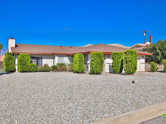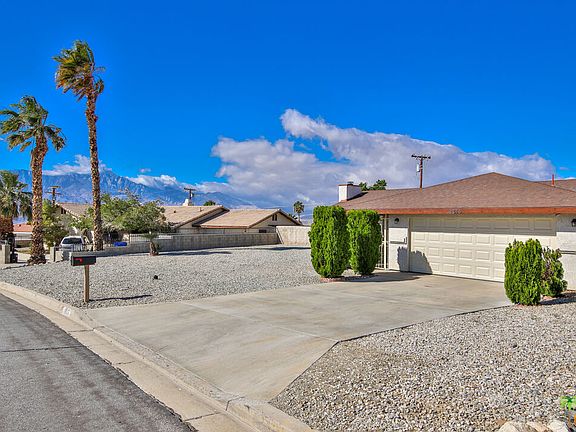 This home is situated in the hills above Mission Lakes Boulevard and has magnificent panoramic views of the San Jacinto Mountains and Coachella Valley. This three-bedroom two bath, 1450 square foot home has cathedral ceilings for a spacious feeling and a brick fireplace to warm yourself up on those chilly winter nights. The master bath has dual sinks, and there is an oversized two-car garage. The back and side yard are entirely fenced in, and a covered patio in the back lets you see the sunsets. There is plenty of room to install a pool in the front, side, or back yard. The front entry has a long gated porch. The landscaping is desert motif, so there is little maintenance. This home is a great value in gentrifying DHS!